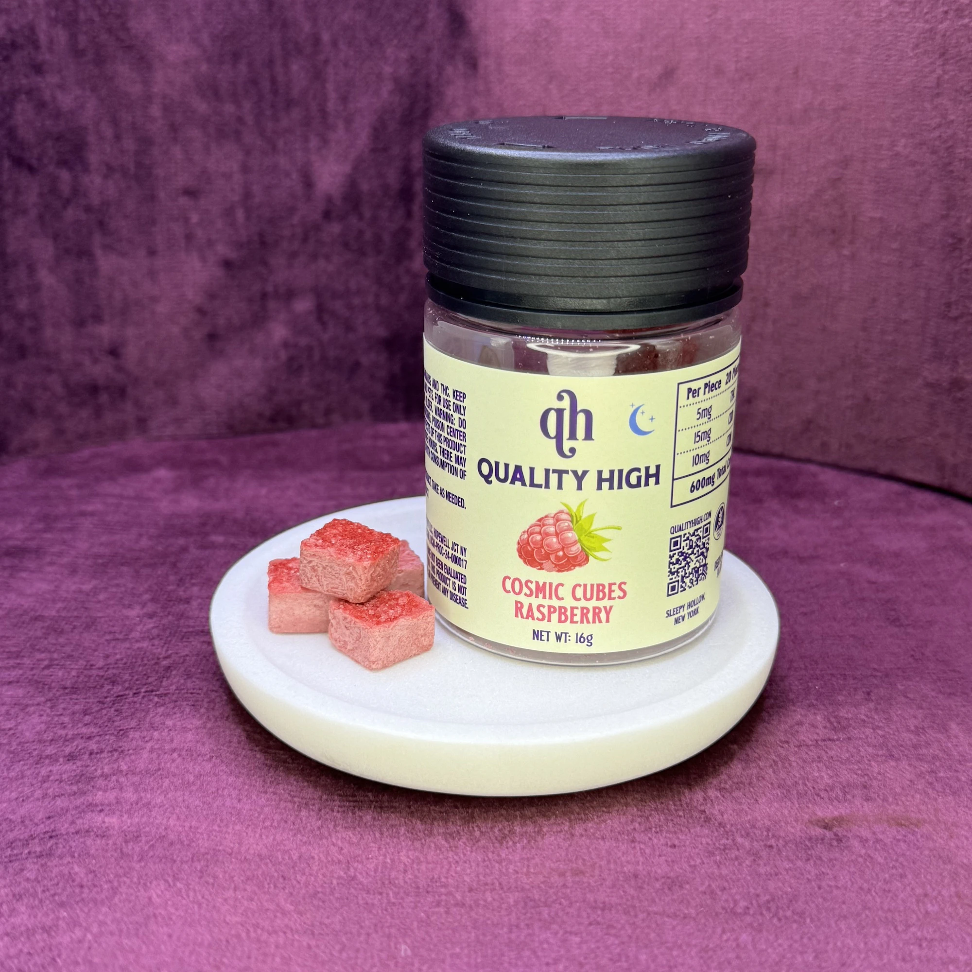 5mg THC | 15mg CBD | 10mg CBN per piece | 20 pieces per package | Bright raspberry blended with creamy coconut milk for a tangy, smooth bite. Gentle and soothing, it encourages relaxation, soft euphoria, and a tranquil state of mind. Best For: Evening wind-down, stress relief, gentle sleep support. Serving Size: 1 cube | Gluten-Free | Vegan | Artisan-Made