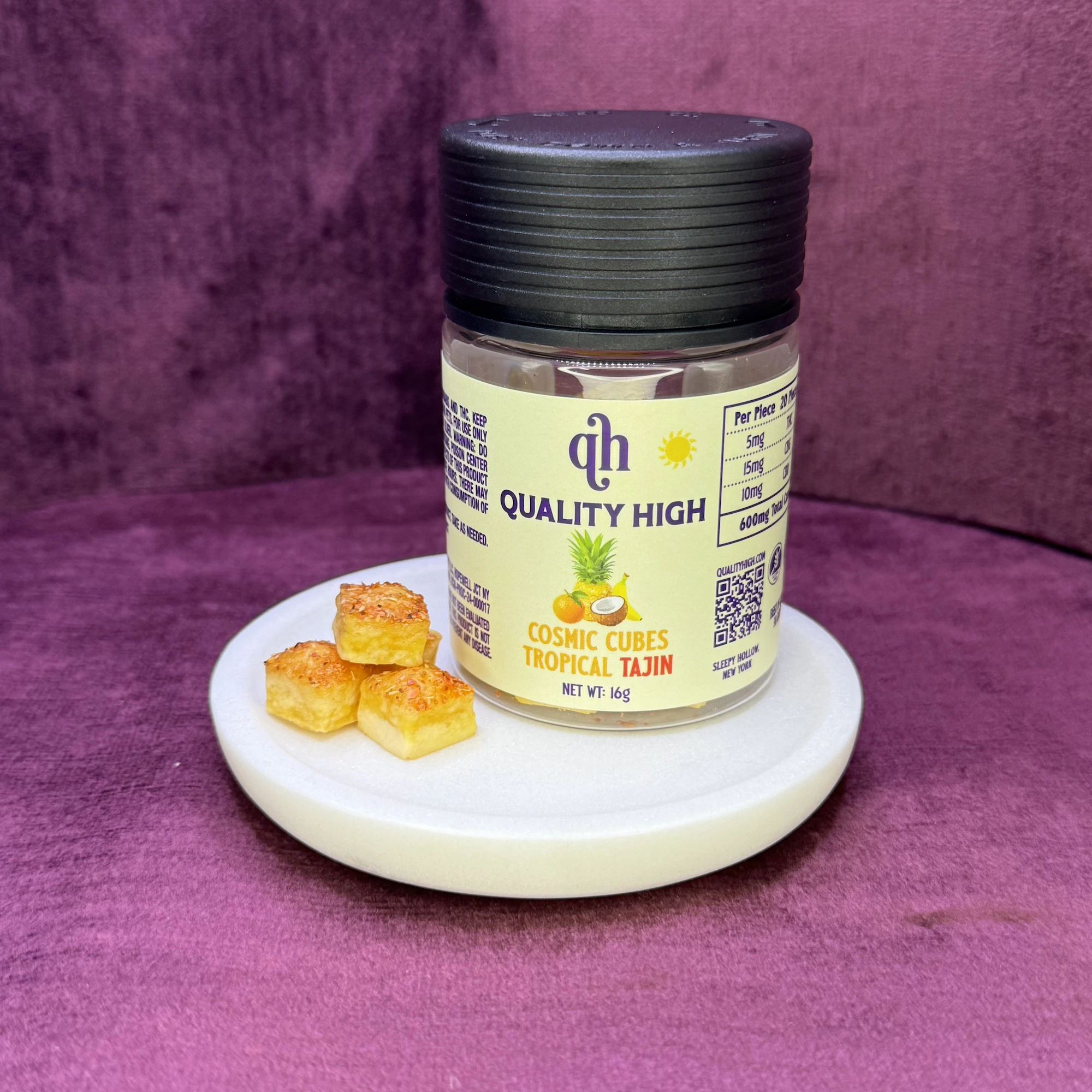 5mg THC | 15mg CBD | 10mg CBG per piece | 20 pieces per pack | Juicy mango and tangy passion fruit meet a creamy coconut milk base, dusted with a zesty Tajín kick. This tropical bite delivers uplifting relaxation with a spark of creativity and focus. Best For: Midday focus, mood elevation, guilt free self-indulgence. Serving Size: 1 cube | Gluten-Free | Vegan | Artisan-Made