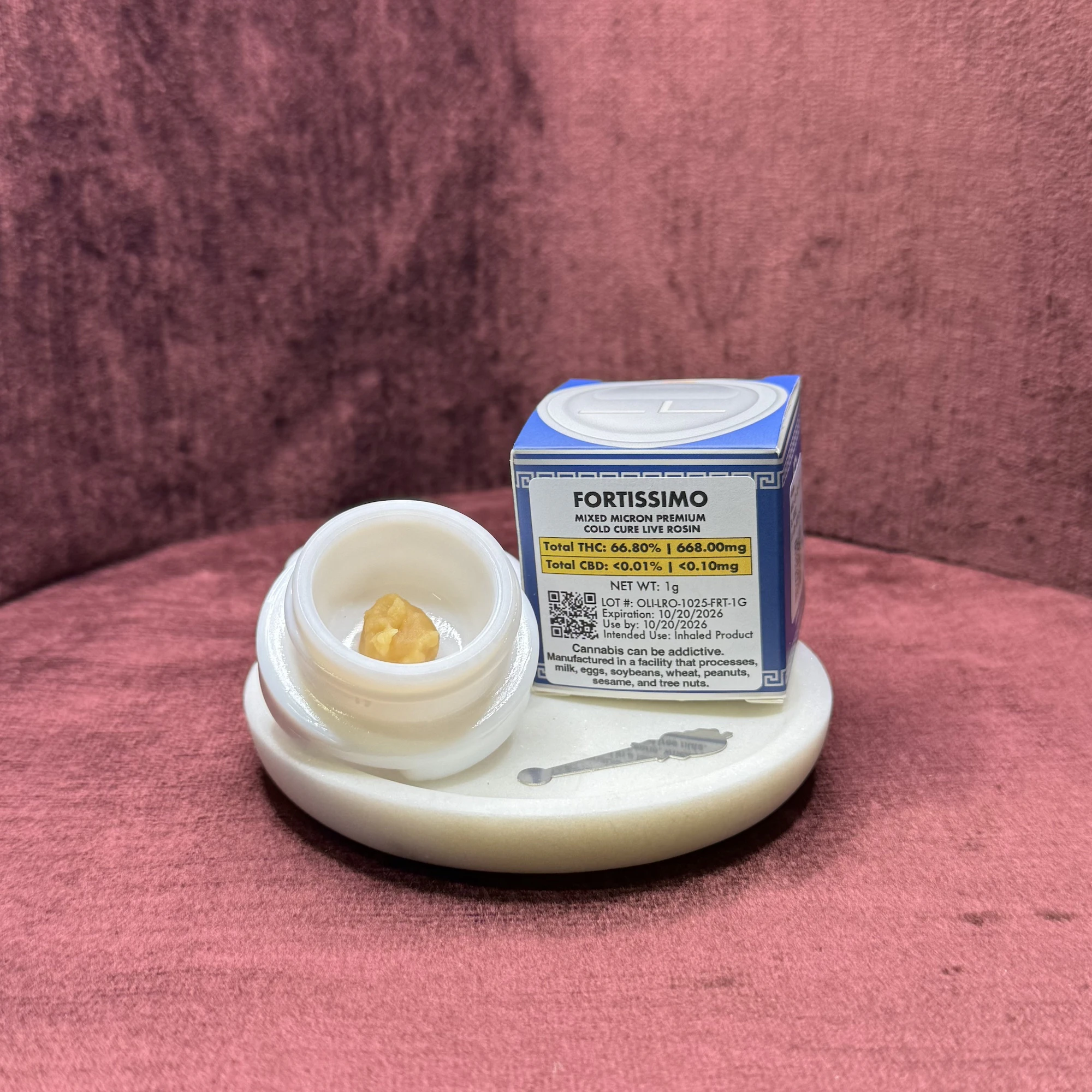 1 Gram top shelf Live Rosin Fortissimo is an indica dominant hybrid strain (70% indica/30% sativa) created through crossing the potent Crescendo X Han Solo Burger strains. The flavor is sour and citrusy lemon hash flavor with a super spicy and peppery dank exhale.
